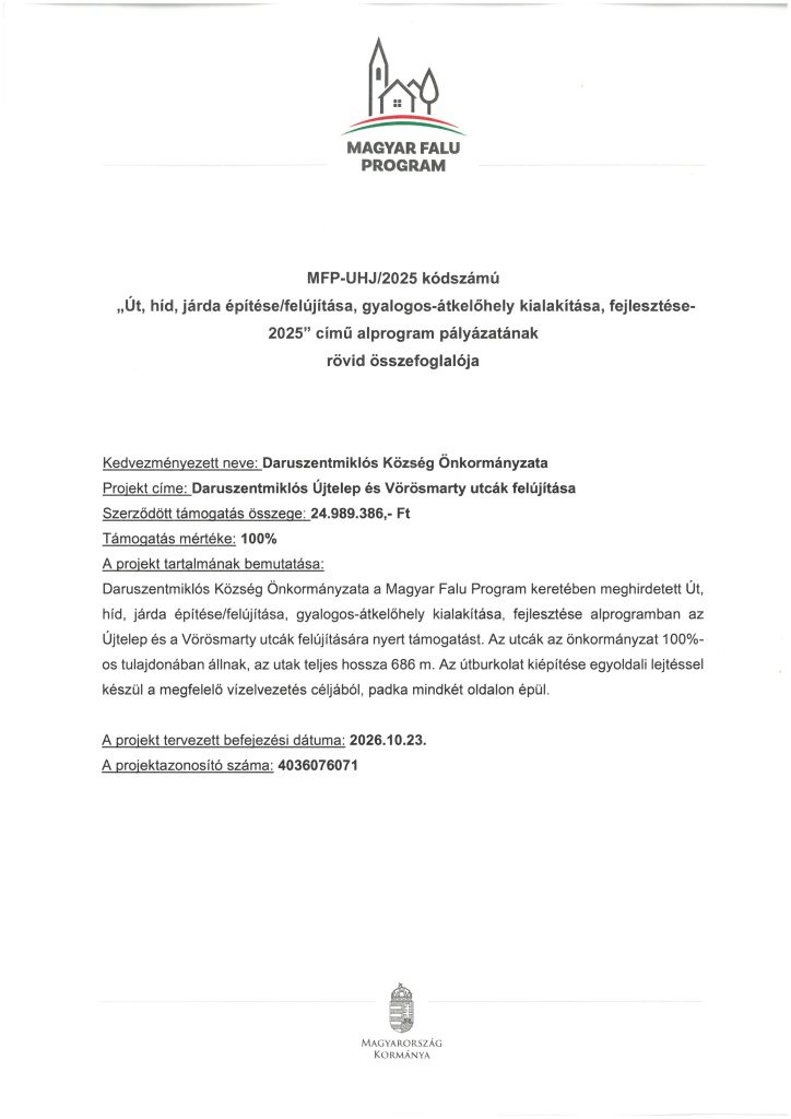 Daruszentmiklós Község Önkormányzata a Magyar Falu Program keretében az MFP-UHK/2022 kódszámú pályázati felhívás keretén belül a Berzsenyi Dániel utca 459. hrsz és a temetőhöz vezető út 0456 és 0457/10 helyrajzi számú szakaszára nyert támogatást. A felújítandó utak teljes hossza 860 m.